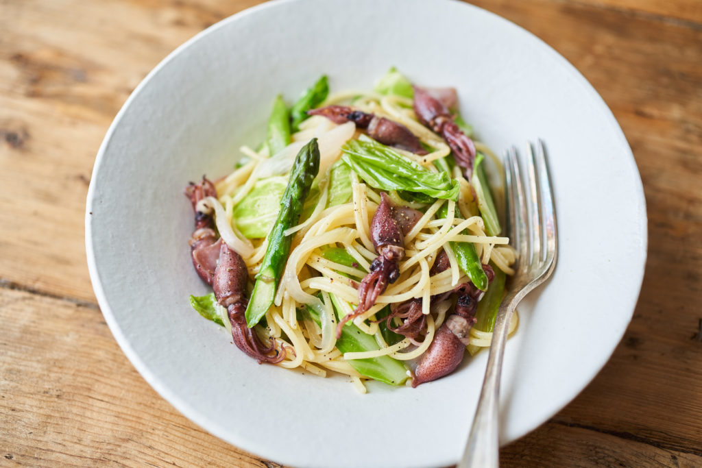 ホタルイカと春野菜の新玉ねぎ、春キャベツ、アスパラを使った春らしいパスタです。