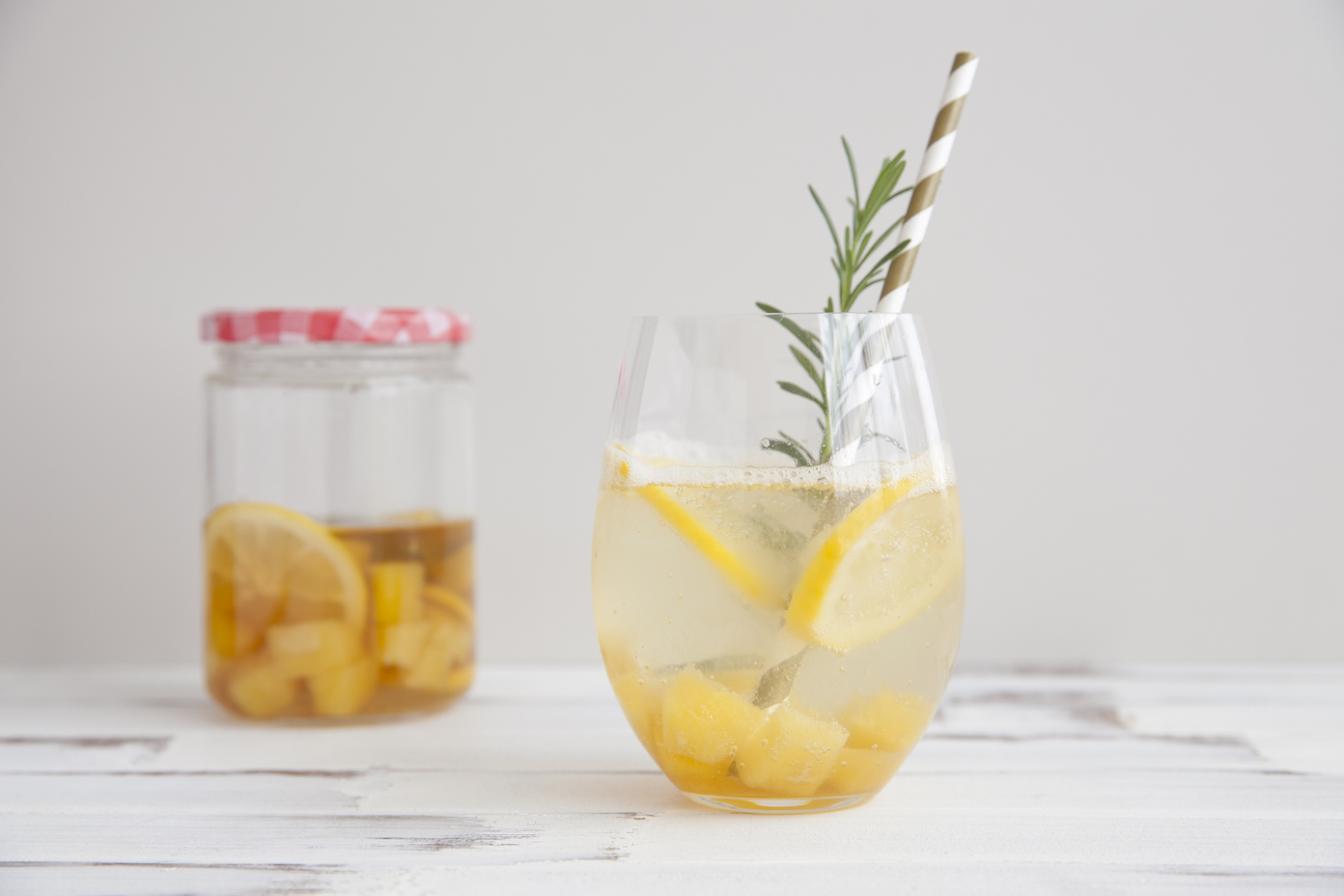 シロップの3倍程度の炭酸水で割り、パイナップル、レモンをお好みで入れてどうぞ。