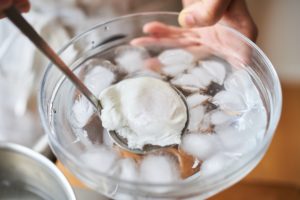 卵を鍋の中心の低い位置から静かに入れる。(※渦の水流によって卵が渦の中心に集まってきます)