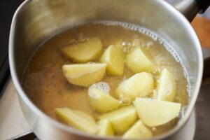 火を止めてじゃがいもをフォークなどで粗く潰し、