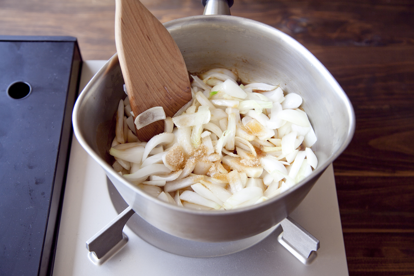 旬の新玉ねぎを甘辛くとろとろに煮て、ごはんにたっぷりかける丼「のっけごはん」の作り方です。朝ごはんやランチ、アウトドアにもおすすめです。