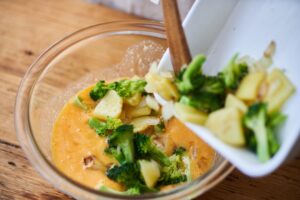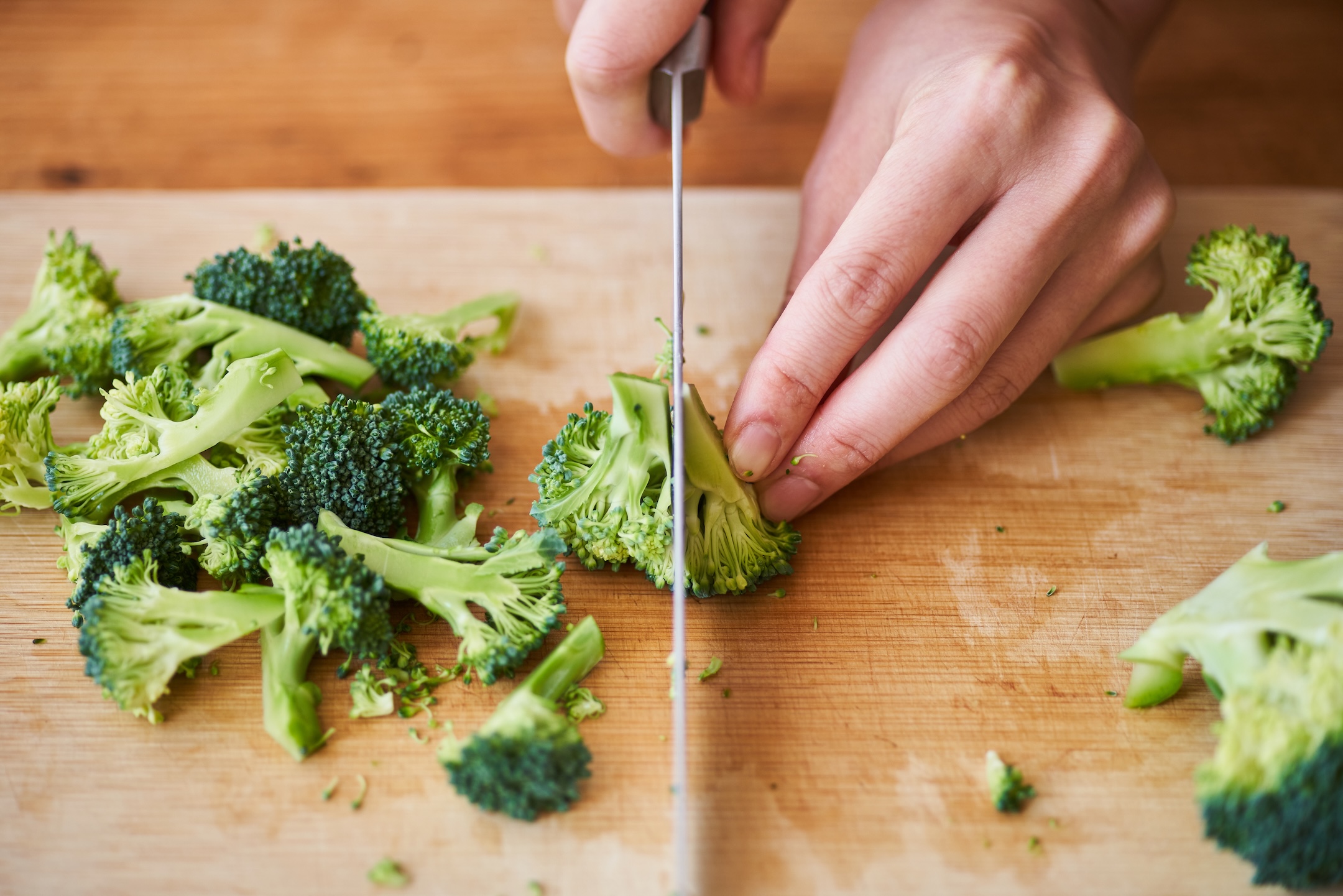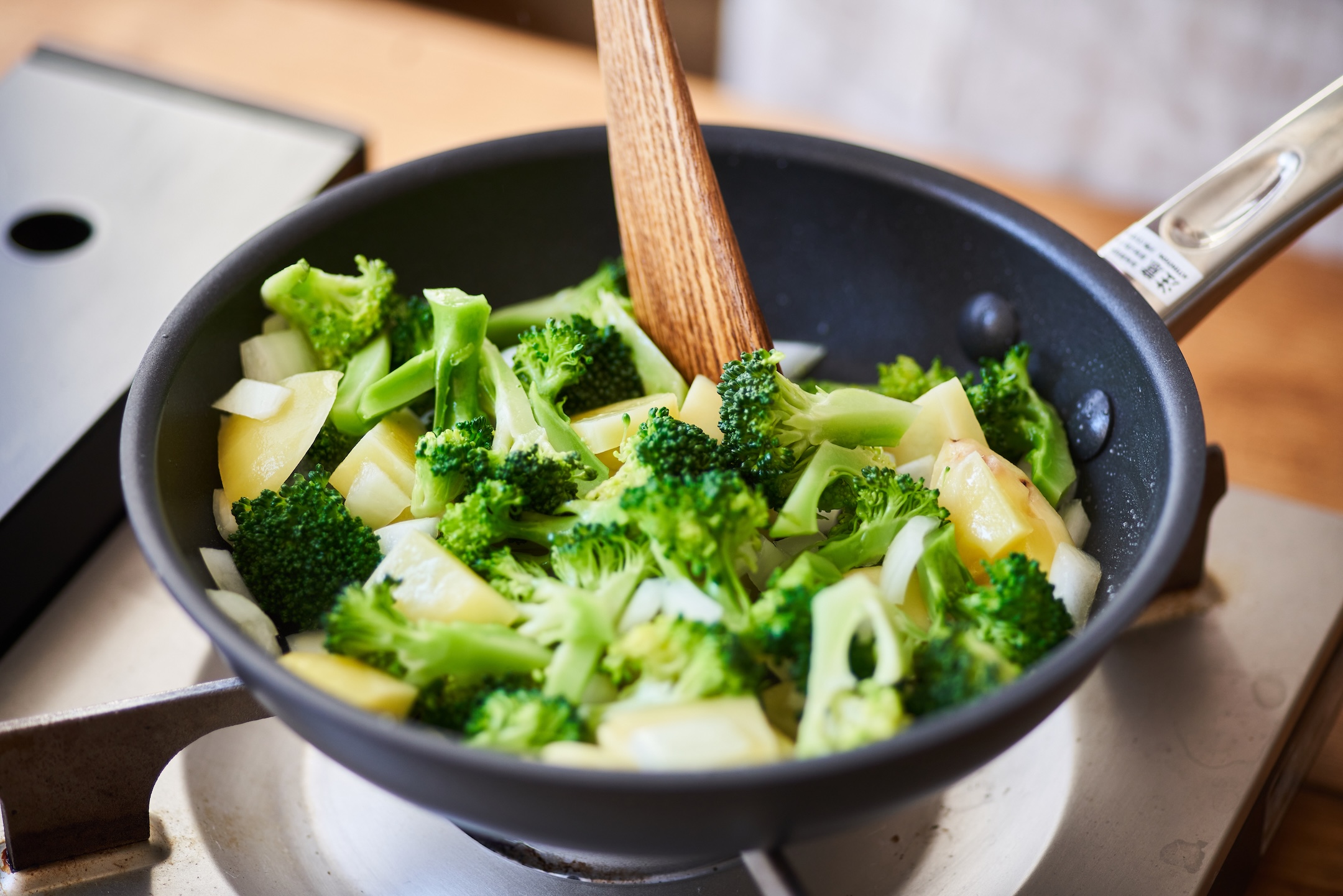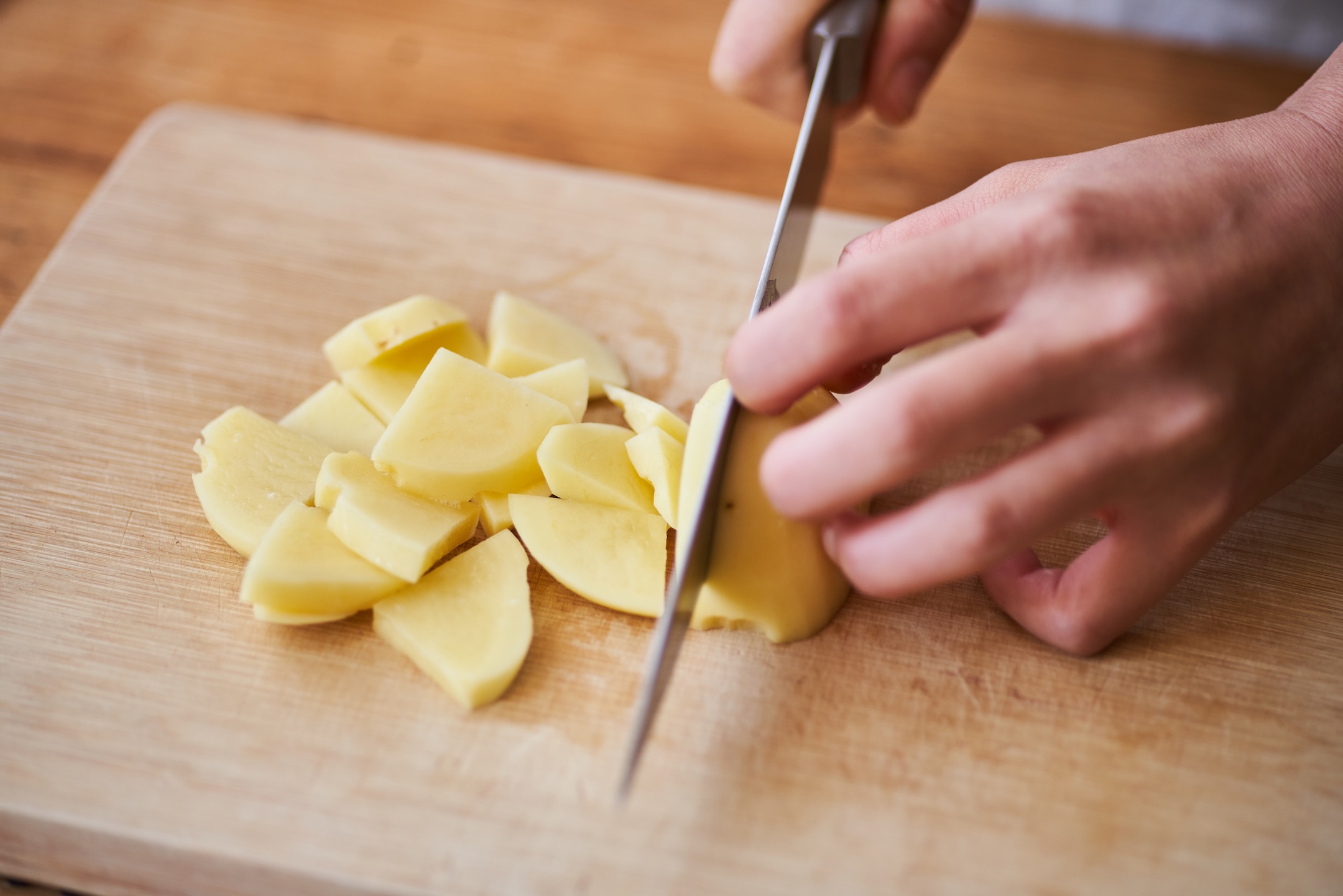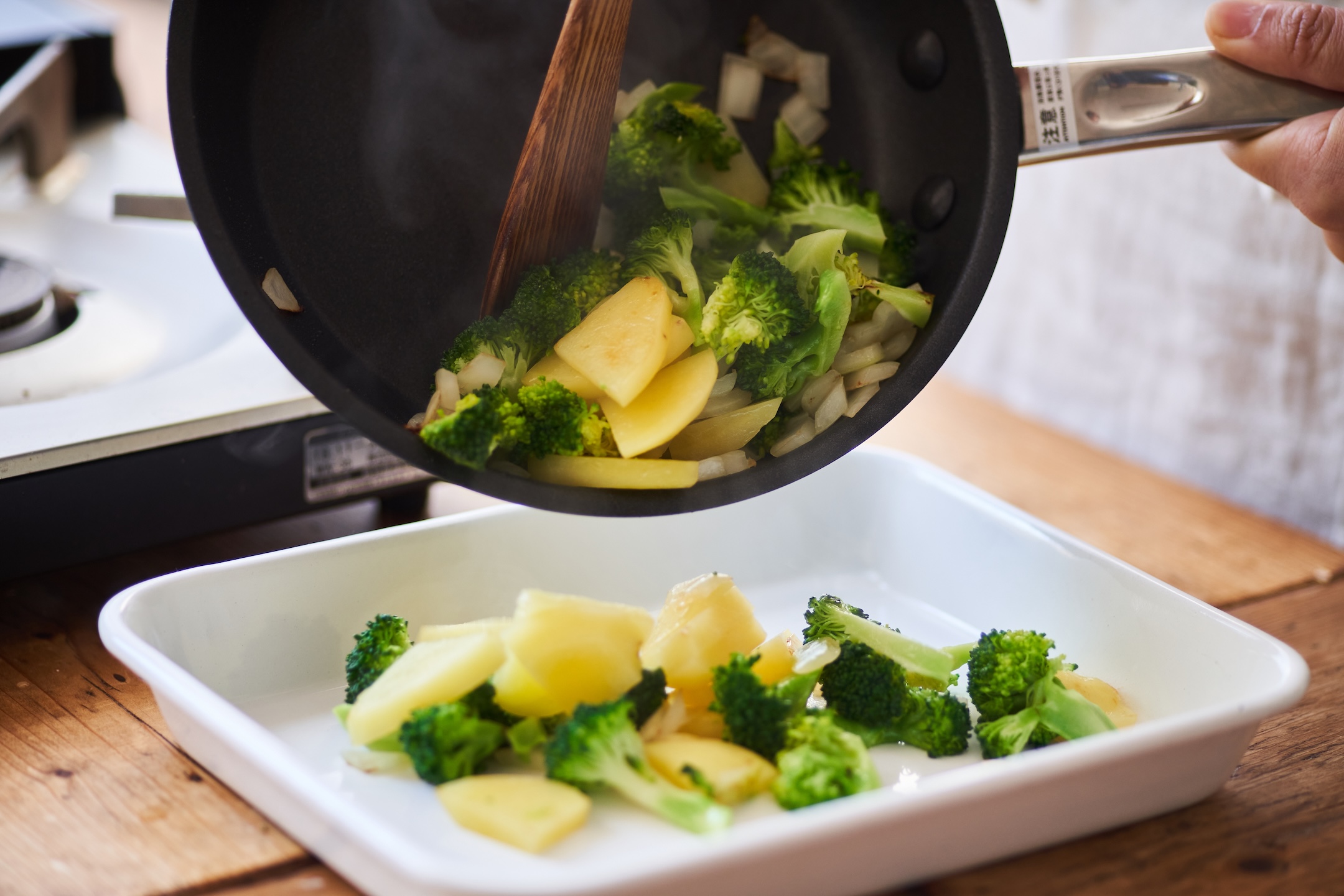じゃがいもは皮を剥いて5mm厚さのいちょう切り、ブロッコリーは小さい小房に分ける。