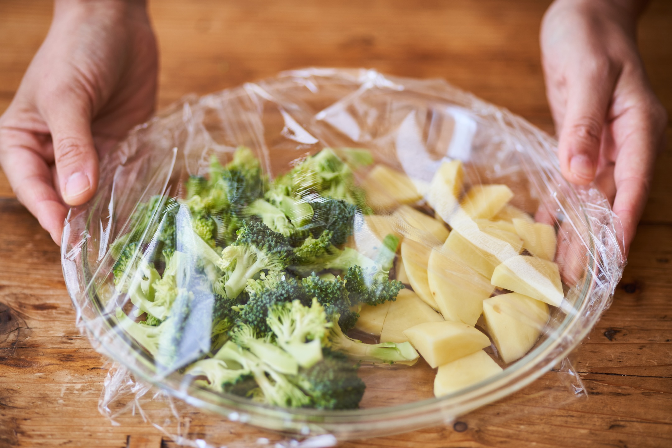 ふんわりラップをかけ、電子レンジ600Wでじゃがいもが柔らかくなるまで、2分ほど加熱する。