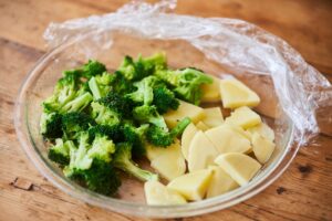 耐熱皿にじゃがいも、ブロッコリーを入れて水大さじ1をまわしかける。