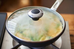 再び蓋をして、弱火にかけ、4分ほど焼く。竹串をさして、卵液がつかなければ焼き上がり。