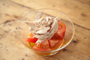 かぶる程度のオリーブオイルを注いで中火にかける。